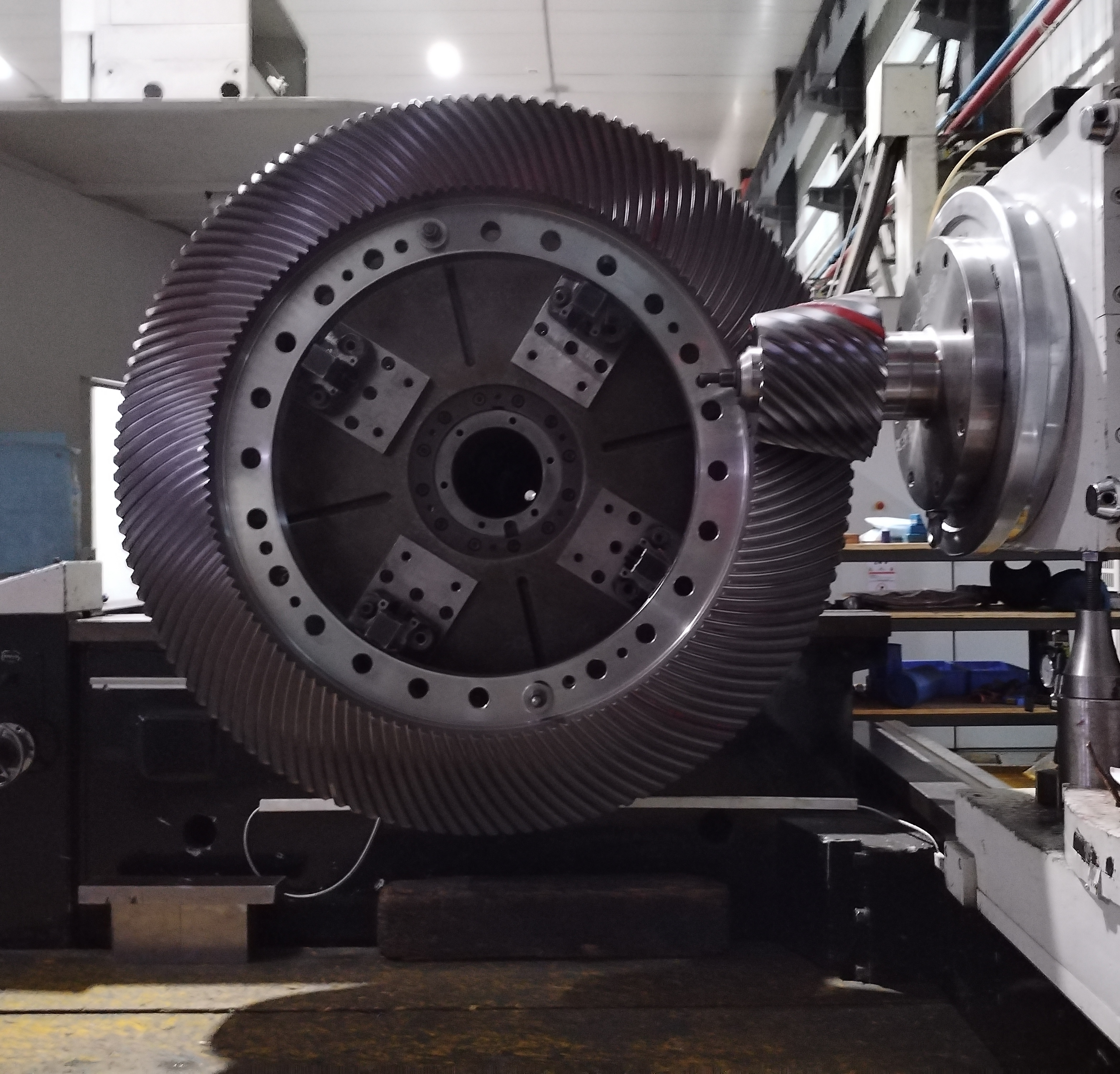 該齒輪直徑1450mm, 采用準(zhǔn)雙曲面齒制。為了降低噪音,采用加大齒寬、大偏置距設(shè)計(jì),增加了重合度。錐齒輪并非越寬越好,為了解決加大齒寬帶來的加工、嚙合等問題,對齒輪副采取LTCA分析,對系統(tǒng)用Romax進(jìn)行動(dòng)力學(xué)分析,同時(shí)利用滾檢著色進(jìn)行修形反調(diào)等技術(shù),保證傳動(dòng)嚙合的可靠性。該項(xiàng)目的成果研制,代表著我司錐齒輪設(shè)計(jì)、加工技術(shù)進(jìn)入了深入研究的階段。為大偏置距大尺寸準(zhǔn)雙曲面齒輪加工奠定了基礎(chǔ),也為超齒寬低噪聲錐齒輪的應(yīng)用積累了設(shè)計(jì)和加工經(jīng)驗(yàn)。
